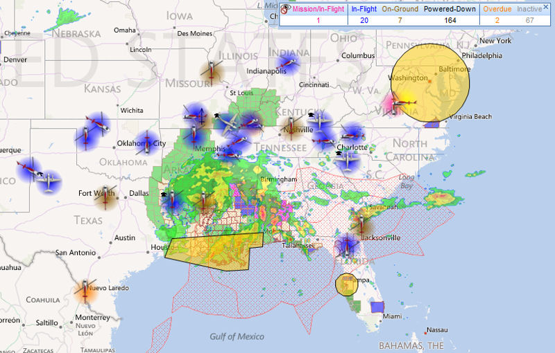 Additionally, the dispatch operators selected to display the current weather patterns. These weather overlays constantly update to warn of the deteriorating weather conditions as the risks from the possible hurricane increased. They also opted to display the current status for all of the aircraft in their fleet at the top-right corner.