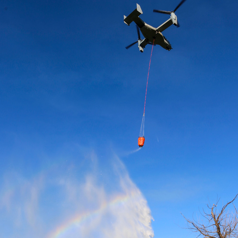 VMM-165 Marines hooked the bucket to the Osprey and made two dry runs, flying the aircraft around the drop area, before making four runs where they actually dumped water on the targets.